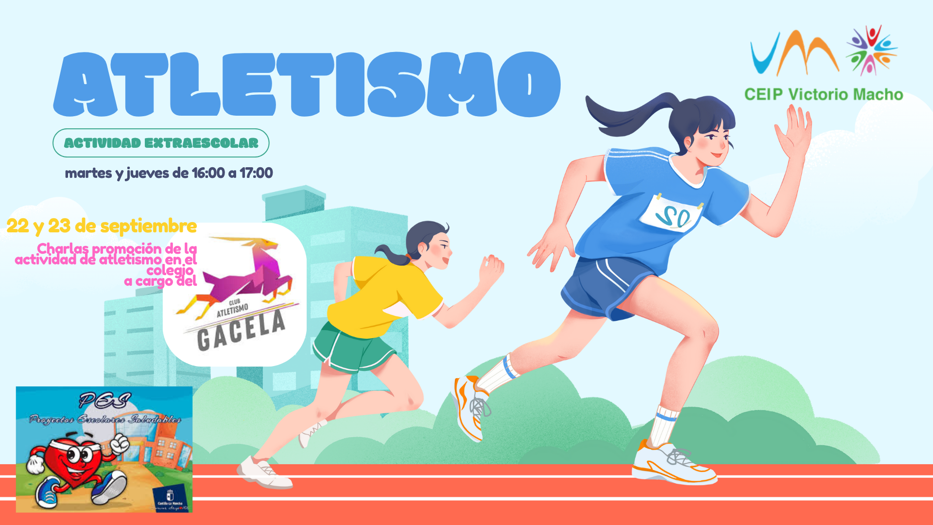 Los días 22 y 23 de septiembre en el cole hemos contado con la visita de Alberto, responsable del club GACELA de atletismo. En las sesiones de Educación Física ha impartido unas charlas al alumnado de primaria de todos los niveles para acercarles este deporte tan divertido que a partir de ahora, los martes y jueves, será una de las extraescolares que organiza nuestro AMPA Tierra Llana.